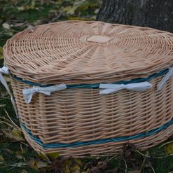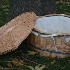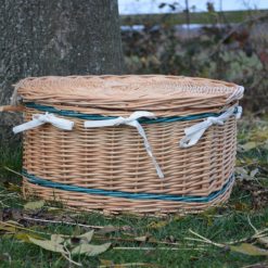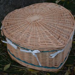 Our wicker love heart pet coffins are made for us to our own specifications, ideally suited to small pets such as Cat, Dog or Rabbits. Hand crafted using natural wicker, a great deal of care and attention goes into making each pet casket. The liner is padded in a cream coloured Jute, no metal staples, glues or plastics are used, allowing these to be fully bio degradable, the lid is held in place with string and neat wooden toggles.